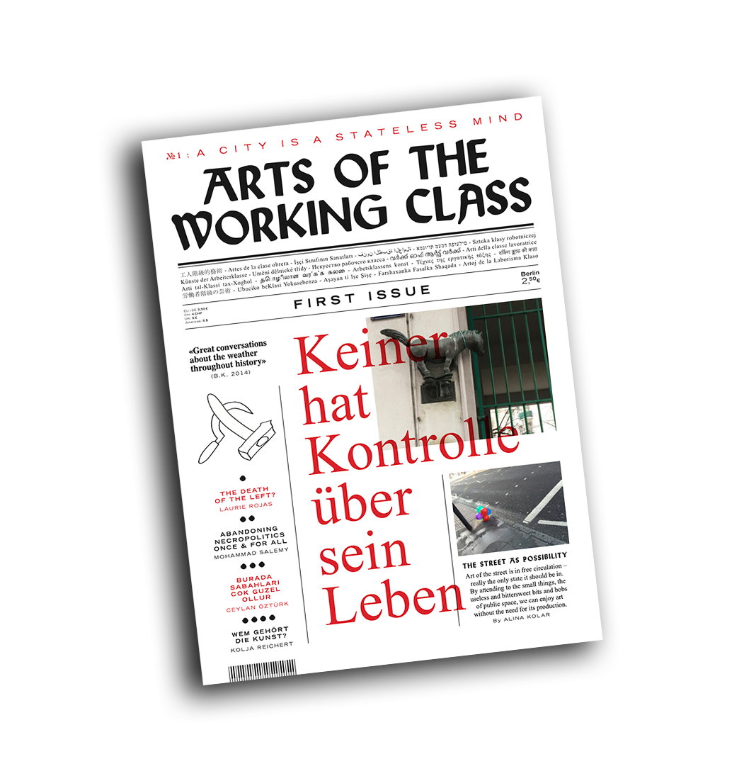 "Arts of the Working Class" is a street journal for poverty, wealth and art. It is published every two months and contains contributions by artists and thinkers from different fields and in different languages. Its terms are based upon the working class, meaning everyone, and it reports everything that belongs to everyone. Everyone who sells this street journal earns money directly. Every artist whose work is advertised, designs with us its substance.