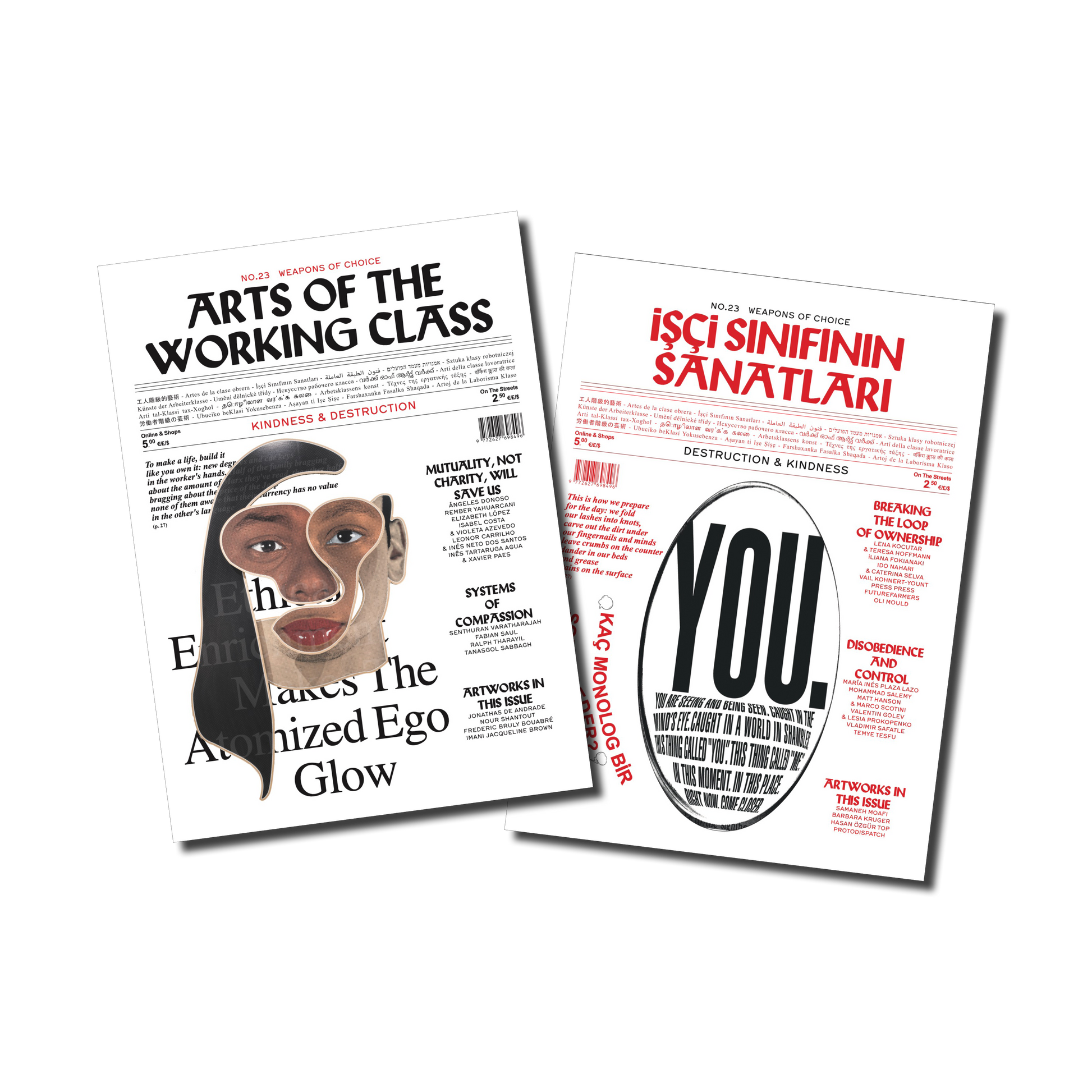 This side was supposed to be on radical care. Within its annual program, titled “Loops of Power,” AWC looks for ways of breaking the inertia of how we consume, live, and criticize. For ways of escaping from exploitative clouds, falling into survival mode, our uncertain times make it impossible to deal with hate speech and the loss of meaning in politics and discourses. But the practice of care within the genealogy of radical politics seems to us no different than the need for help, nourishment, caresses, and friendship everywhere else. Radicality seems to manifest itself differently—fragmented, hidden, everywhere these days. The radicality in care, or care in radicality – simply the kindness people swore to each other through the lockdown – seems to have vanished. Kindness, not as an imperative, but as part of a struggle. Kindness is hard within systemic inequality and power structures. Yet it can also be the way to allow us to understand the urgencies we all carry within us to coerce subjects into new forms of surveillance and unpaid labor, to make up for institutional neglect, and even to position some groups against others, ignoring the temptation to determine who is worthy of care and who is not. Allured by demolition that is not followed by forms of coercion and control, we find ourselves in the happy presence of action painters and abolitionists, interpreters of the soul and union workers. In the hold of the ship, the enslaved have organized forms of resistance, holding their voices high through mourning. This side of the issue is now, as you foresaw, on the persistence of kindness. It is determined by the series of Jonathas de Andrade “With the Heart in the Mouth”, the stitches of Nour Shantout and the drawings of Frederic Bruly Bouabré. It is sliced into two chapters, edited by Elisheba Fuenzalida and Senthuran Varatharajah: On systems of compassion, and on mutuality as a radical act. Both look into kindness as a choice, not as an inherent characteristic of humans, nor as religious treaties. But they are both chapters that offer empathy through spirituality and poetry, protest and rage. To that end, the texts and artworks in this first half of an issue titled “Weapons of Choice” remember grandmothers telling us to “kill them with kindness!”, while holding the knowledge that the time and labor of caring cannot endure if the conversation is canceled before we have come together to build a resilience to our own collectivity. Look for multiple solutions to this languid cry for alternatives to this dying era.