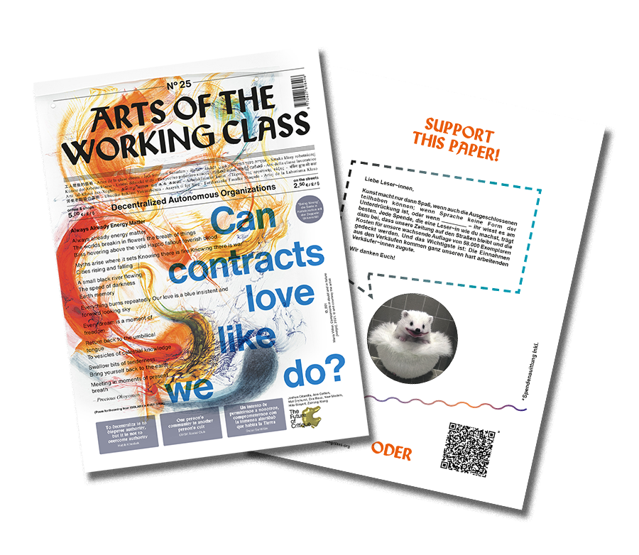 DAOs—Decentralized Autonomous Organizations are the first of five forms of organization that AWC will look into throughout this year’s overarching theme, Bursts of Solidarity. We ask why, with whom, and especially how we can resist and transform the world together with all of the other troublesome creatures around us. If ideals are not enough—since everything can be tokenized for profit—how can we decentralize the power of money in people?